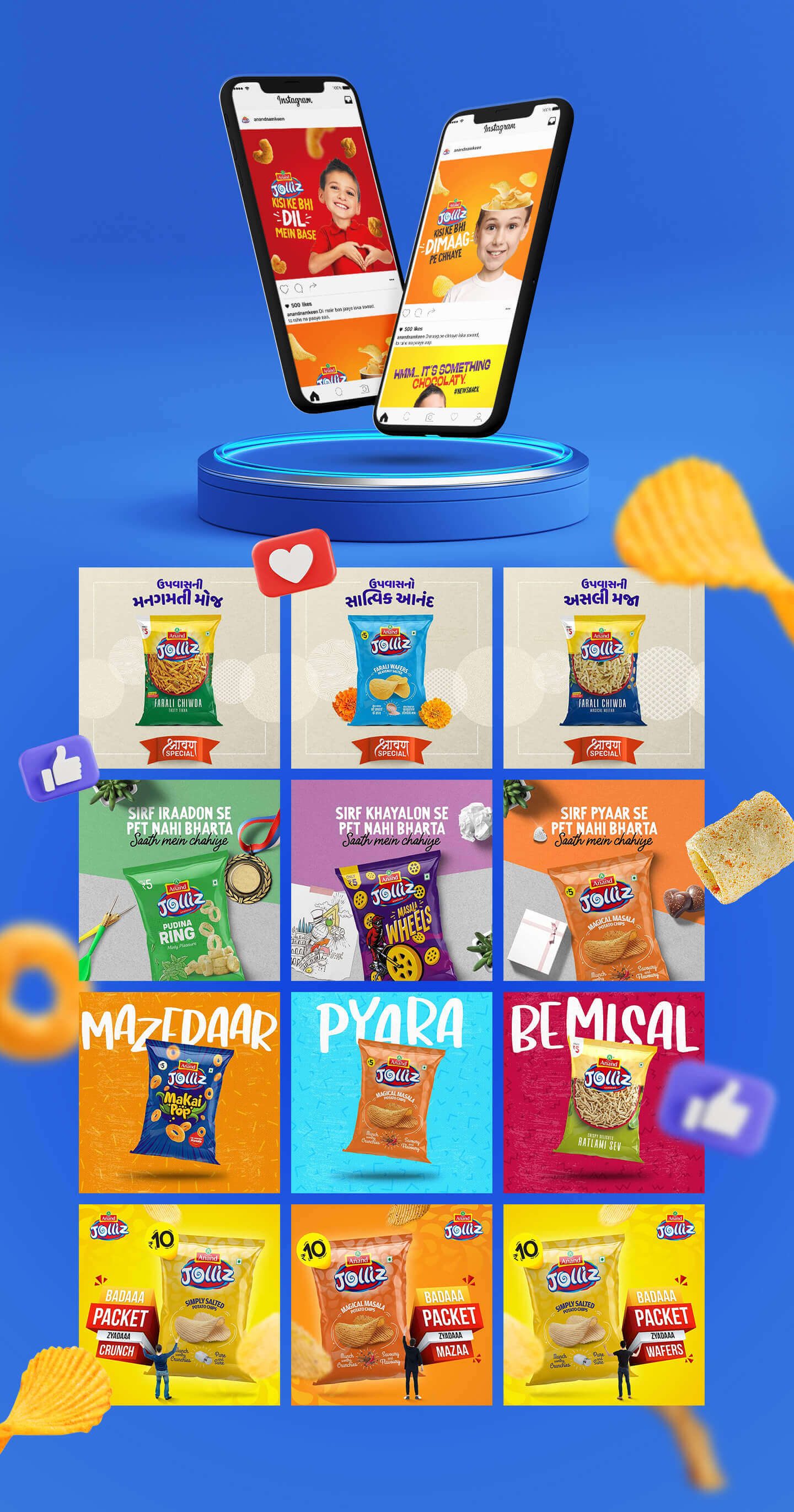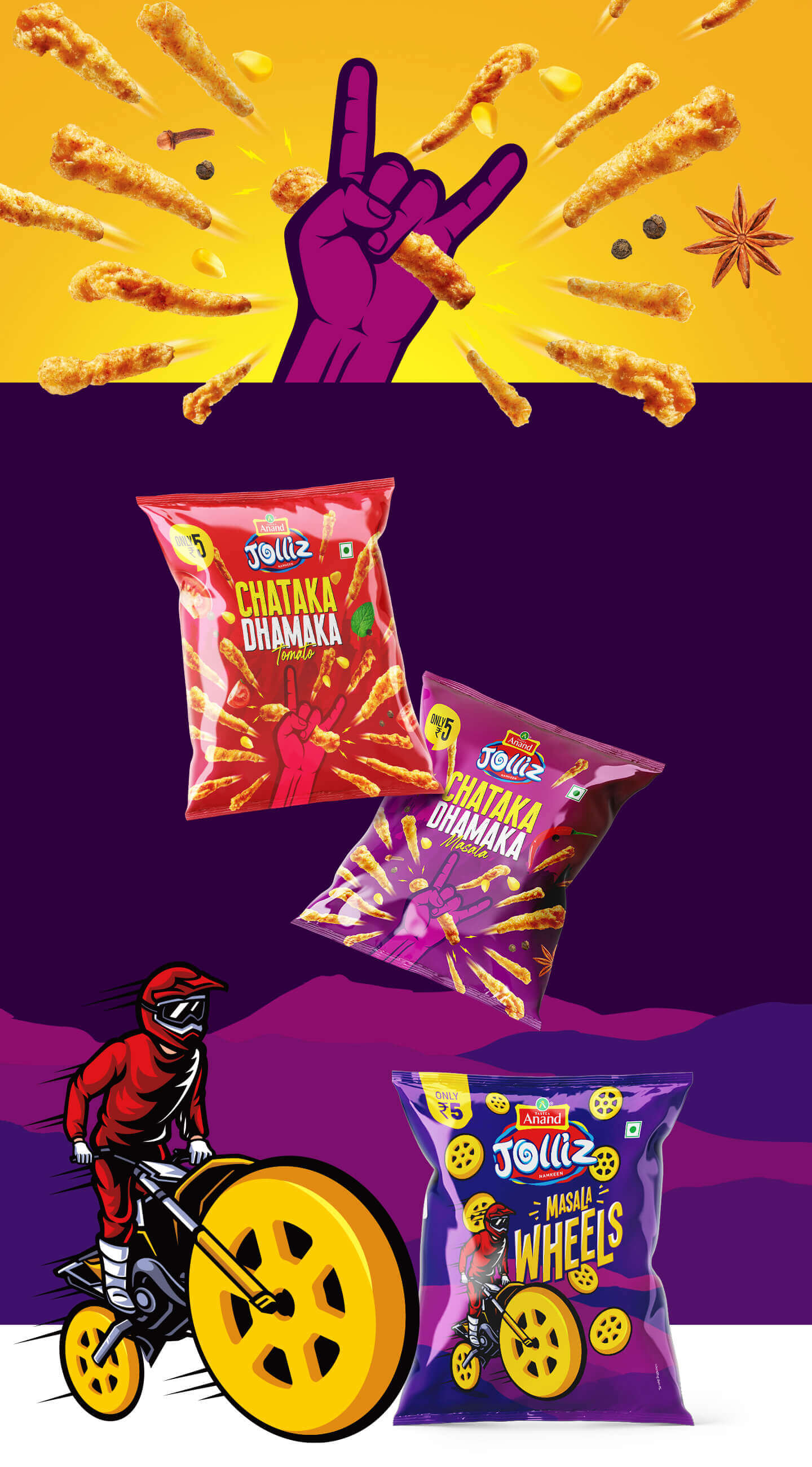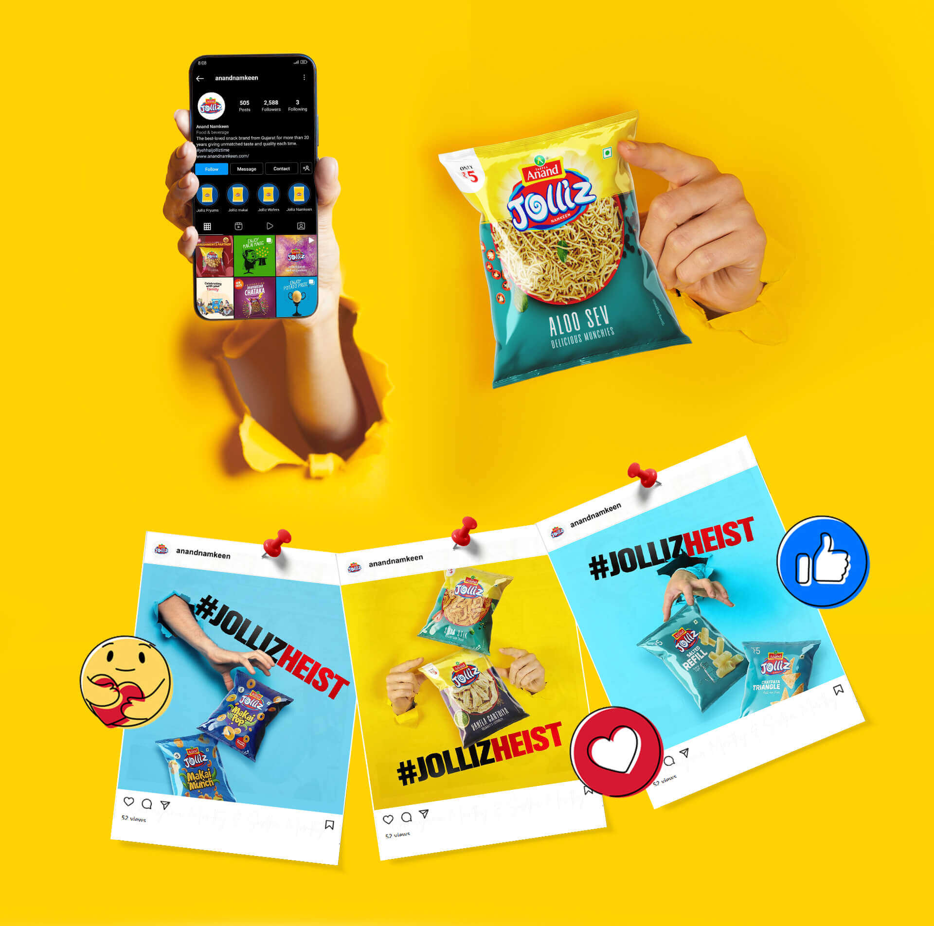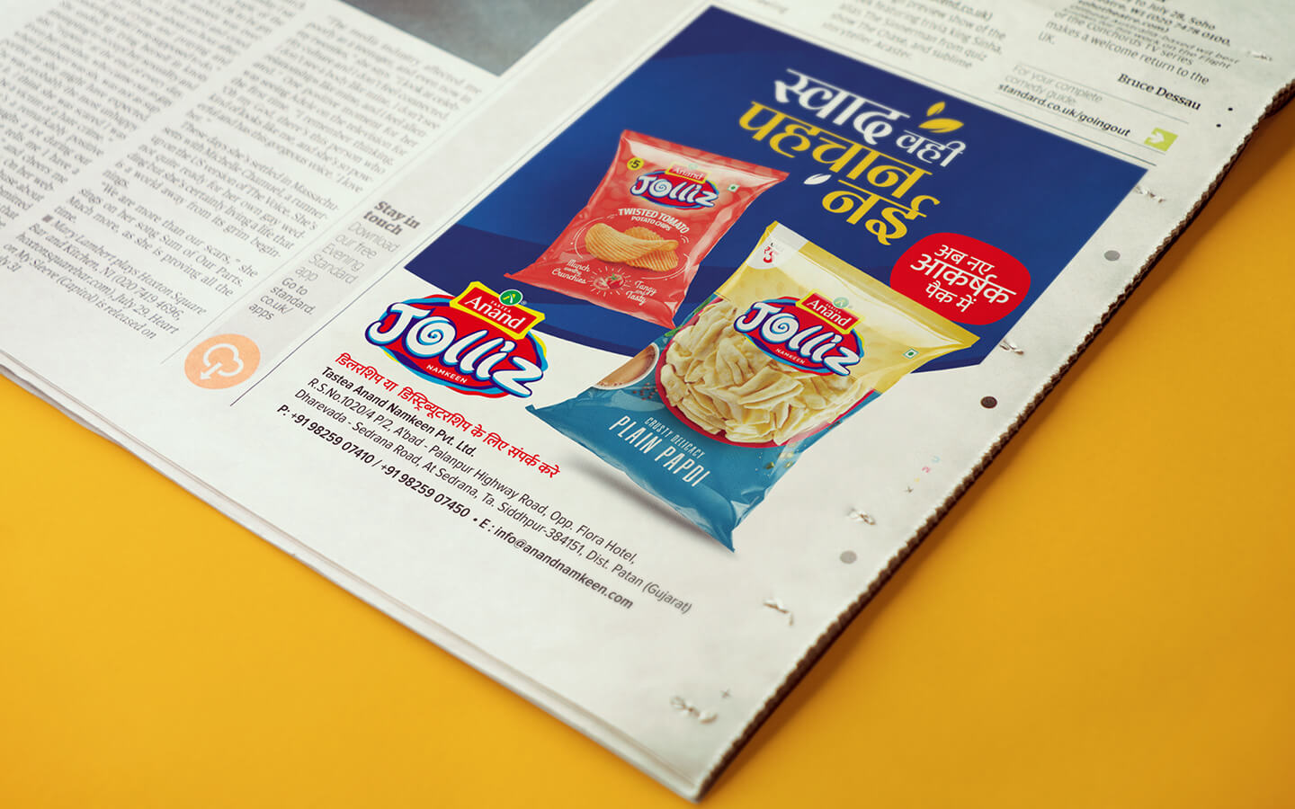 We recommended that client let the parent brand, as it is and create a new sub brand, that could leverage its legacy and also have a unique positioning of its own. The word 'Anand' means happiness in Hindi and the world 'Jolly' denoted the similar feeling. We hence suggested the new brand name as 'Jolliz', with a logo structure having Anand Namkeen endorsing it. We were confident that in a matter of just 2 years, Jolliz will become synonymous to Anand Namkeen. And as we speak, Jolliz is capturing the market at a steady pace. For Jolliz, we have enjoyed delivering the whole package right from brand identity, packaging and collaterals to the digital experience.