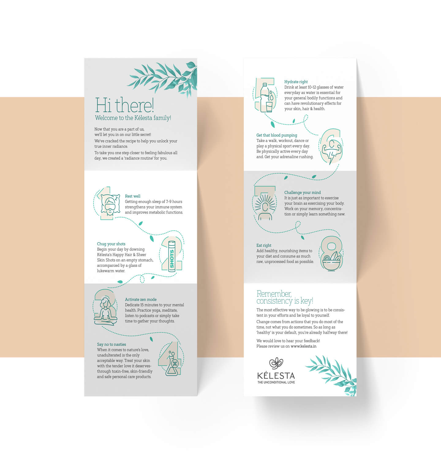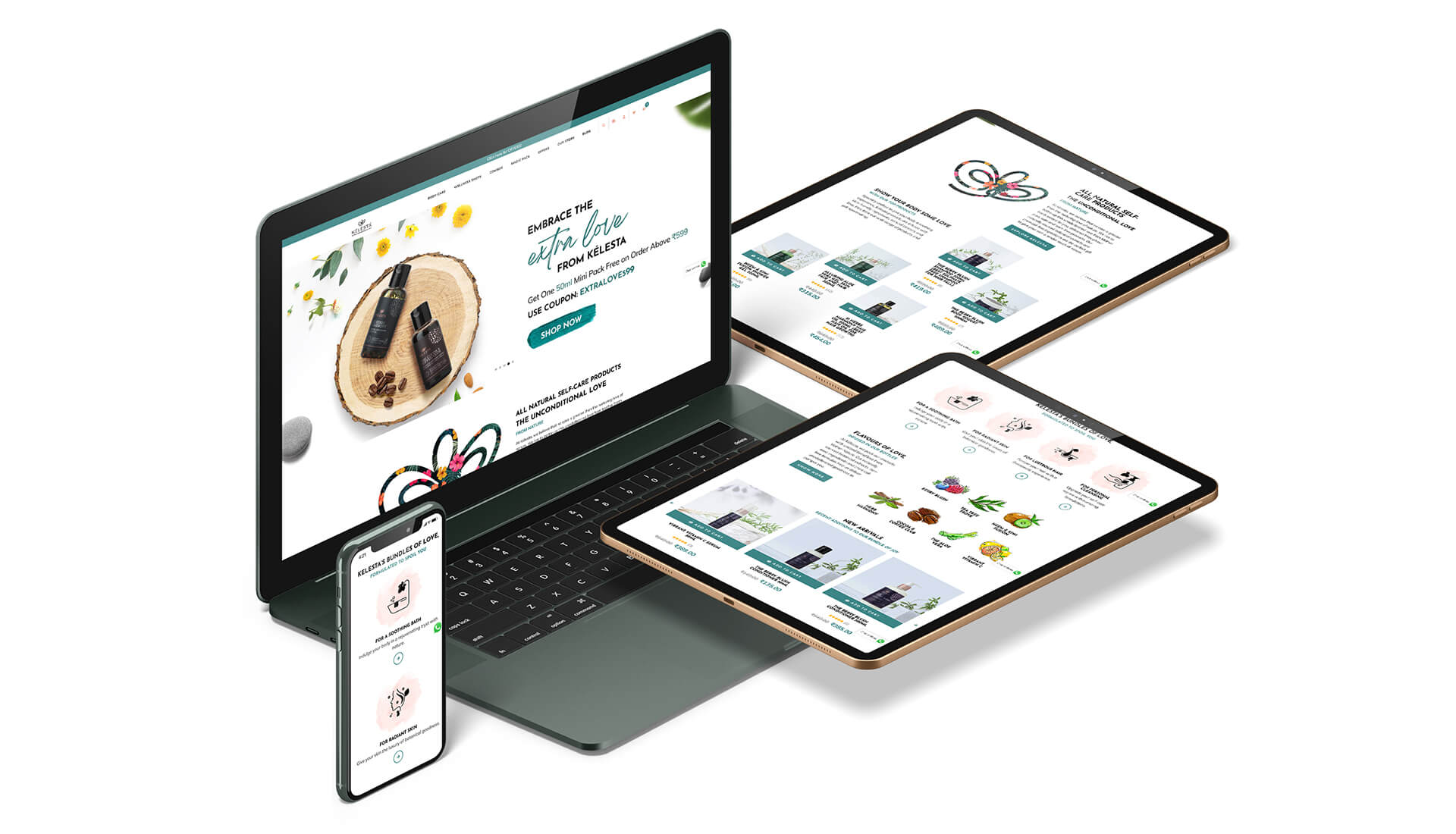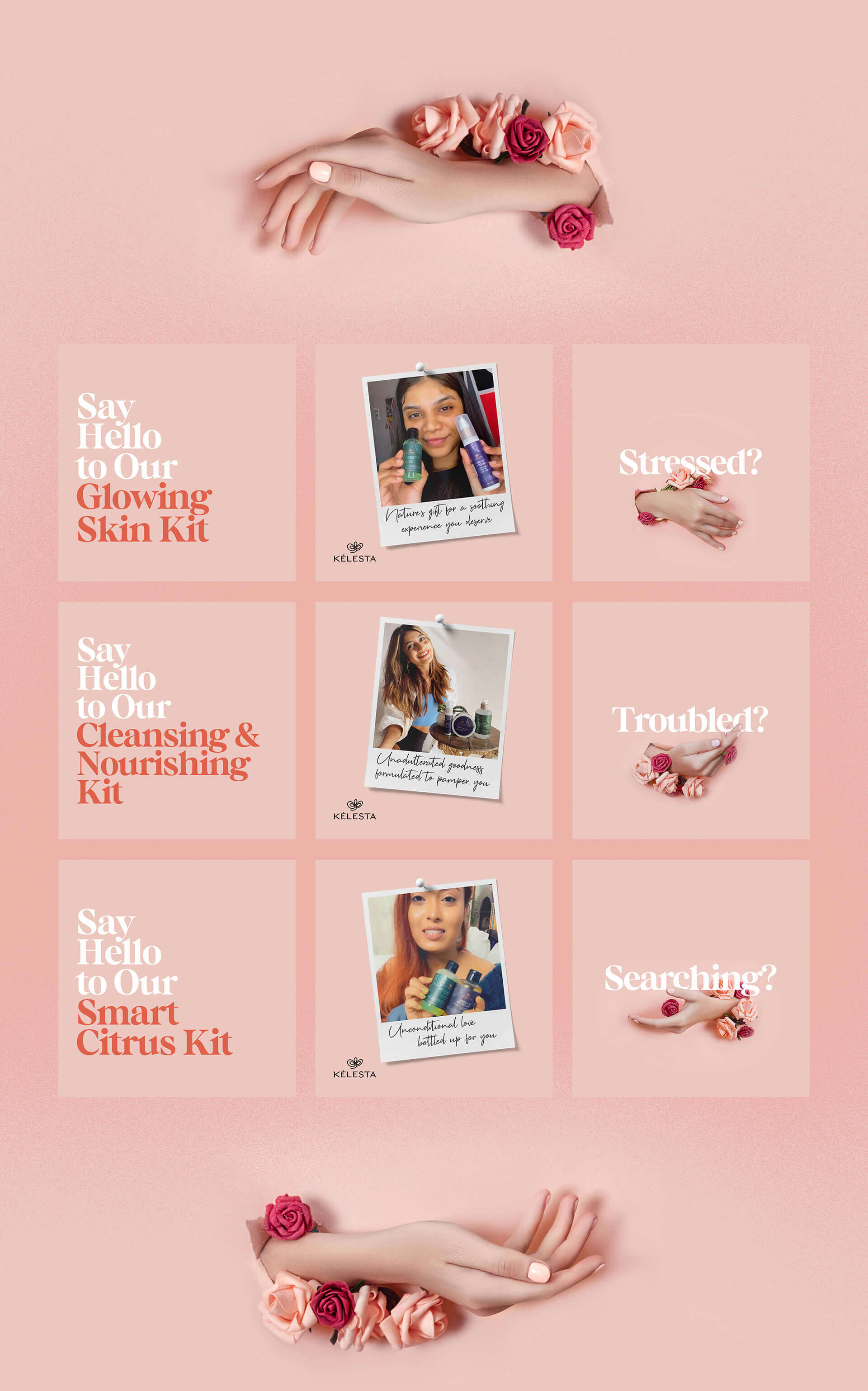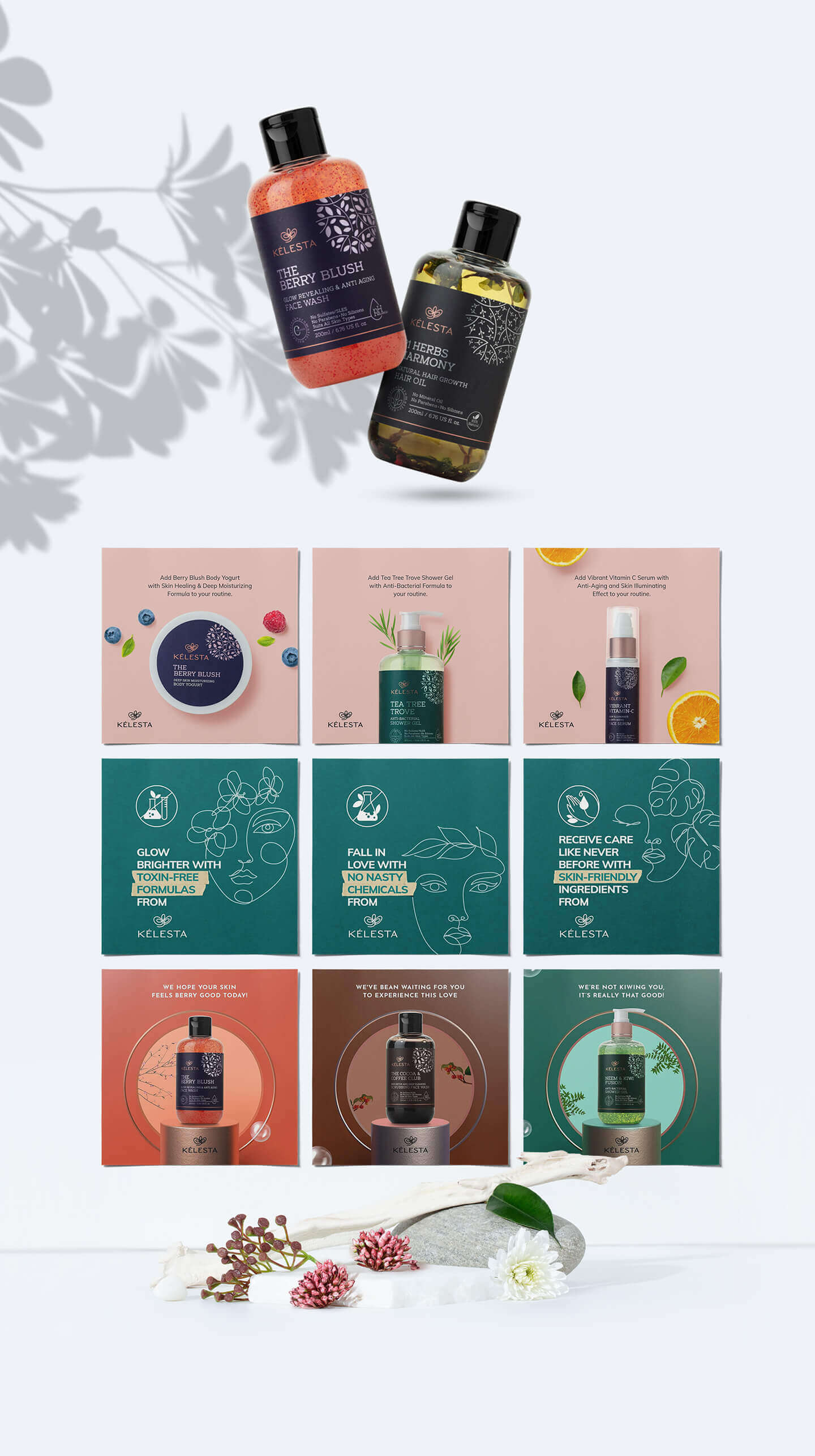 The brand name Kelesta was derived from the word 'celestial' and the logo was an inspiration drawn from the angelic language symbol representing 'unconditional love'. After the logo, we moved on to the packaging, the photography and the website. The metallic packaging of Kelesta has shapes and forms that signify the natural ingredients contained in each of the product variants. We also launched the brand on digital platforms and centered the communication around educating the consumers about skincare & haircare, highlighting the aesthetic looks of the packaging at the same time.