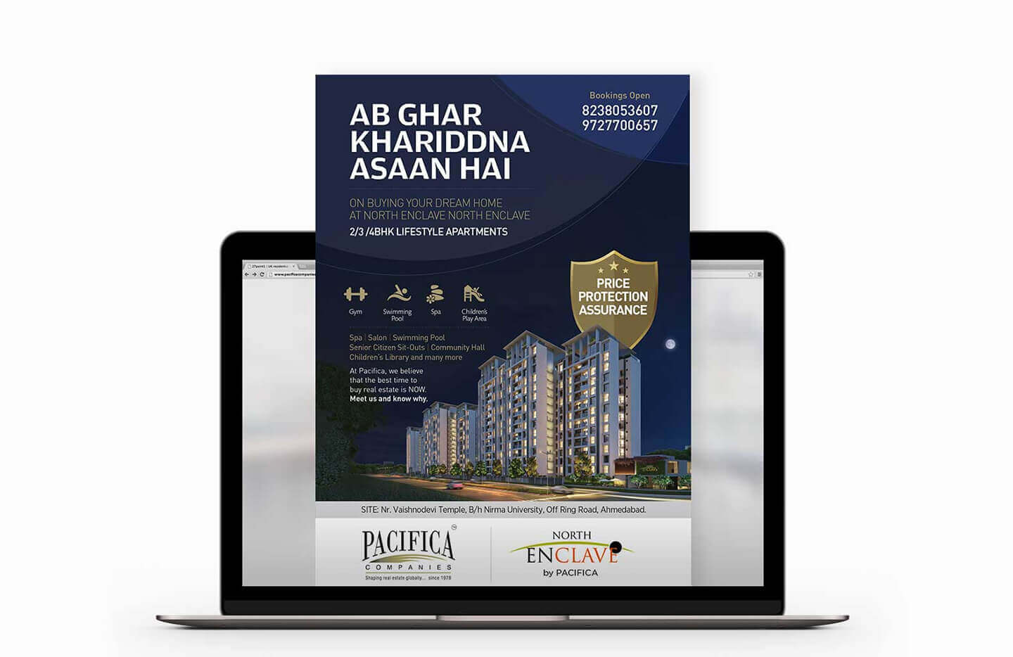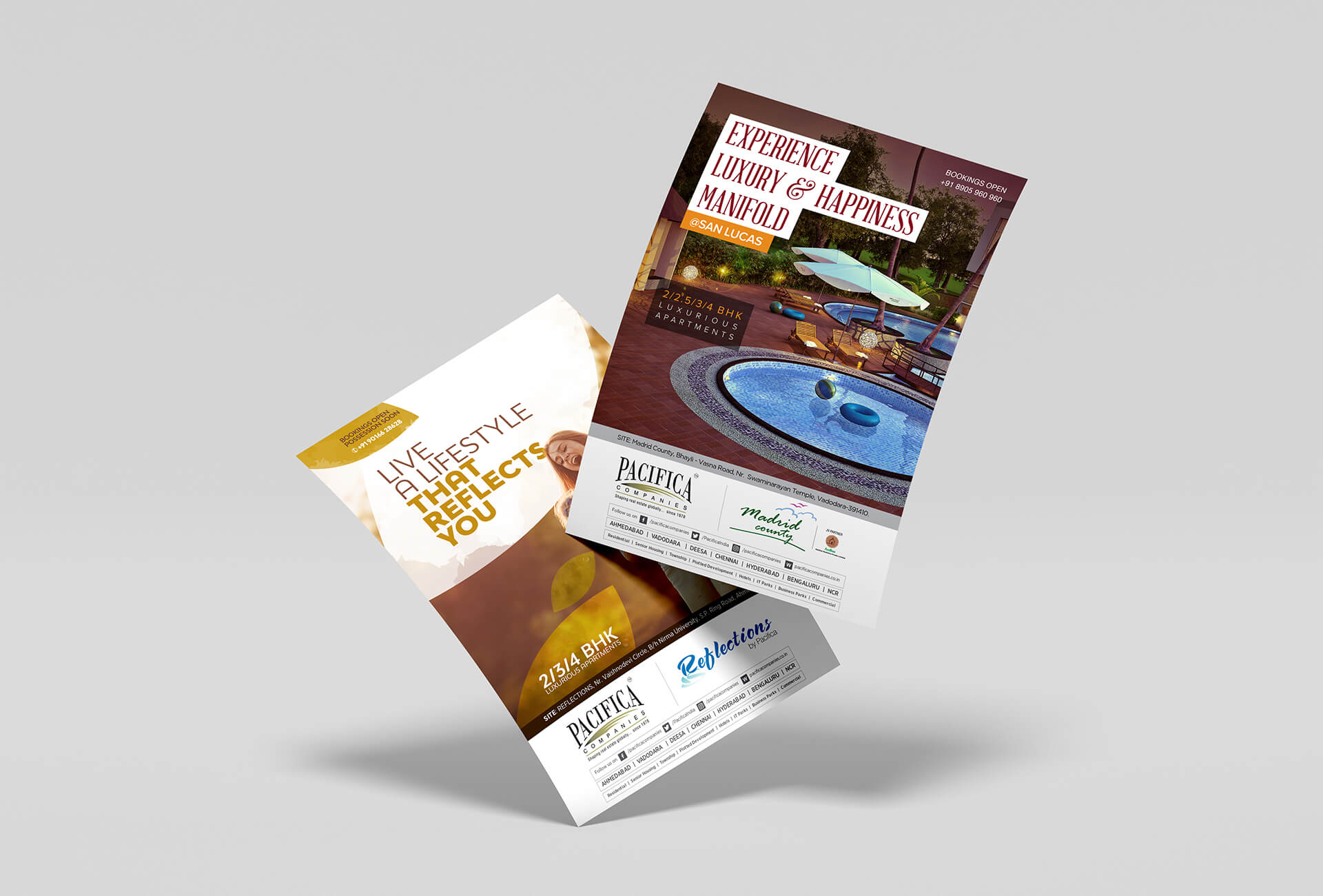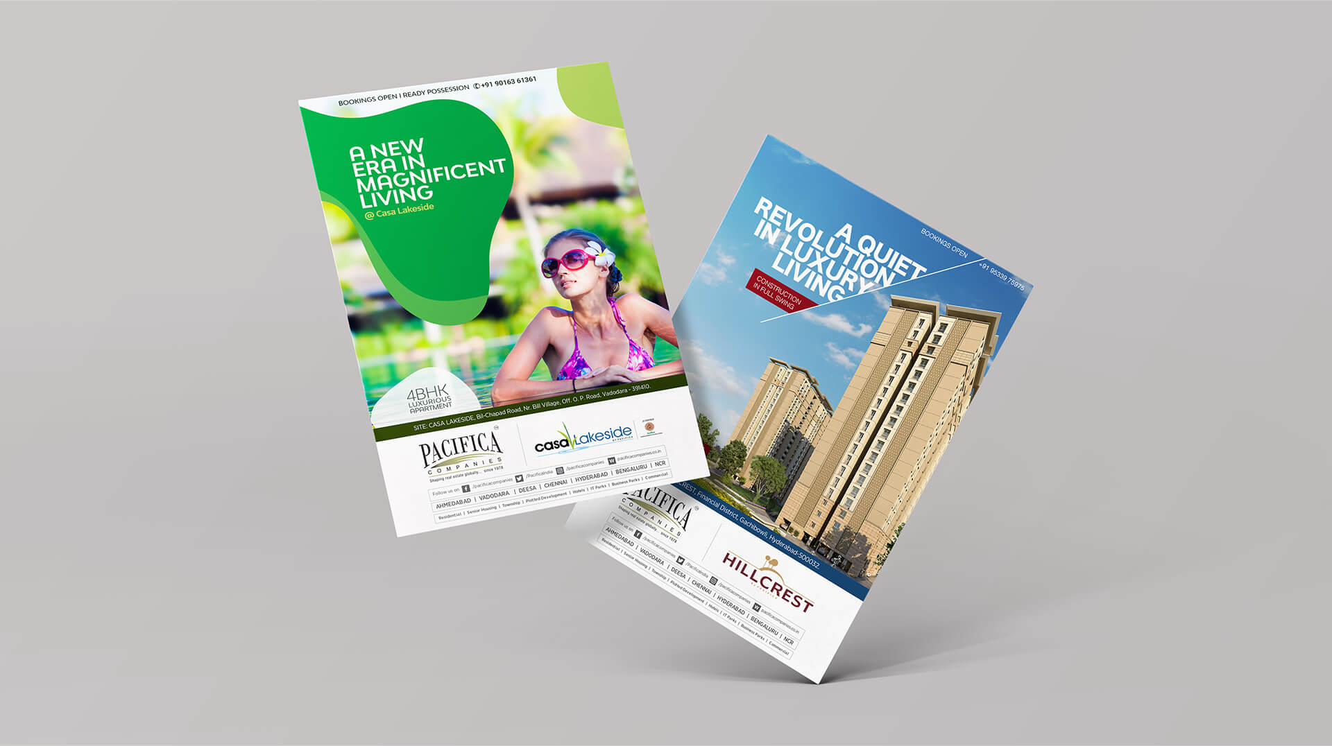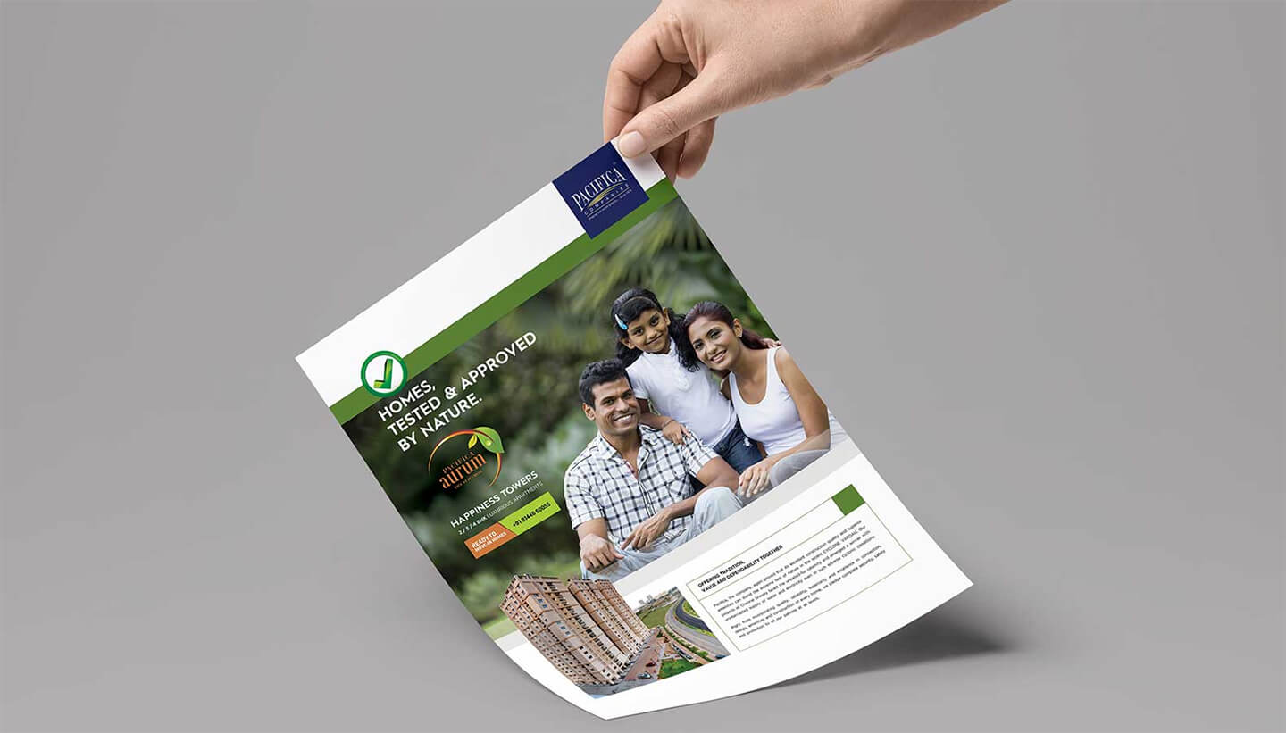 Pacifica is a well known name in the real estate sector and we were approached by them to design their hoardings, e-mailers, newspaper ads, inserts and flyers. Since multiple projects were being promoted at the same time, the challenge was to ensure fast paced delivery in short turnaround times, almost on a daily basis. Each project had a theme, a promotional language, and most importantly amenities, offers and a pricing of its own.