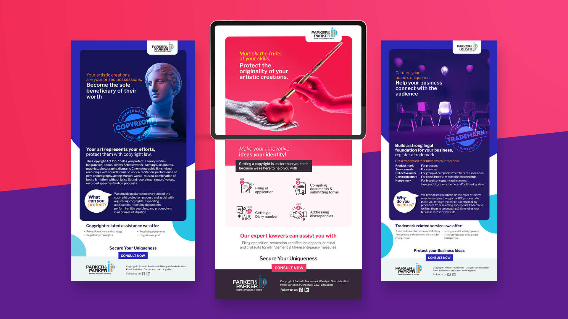 We saw 2 challenges in our journey with Parker & Parker. We started with Logo design, where the client did need a revamp but also wanted to ensure that the new identity is similar to the old logo as much as possible. Moreover, when we proceeded to digital marketing, we came across the other challenge. It is an unsaid rule in the Bar Council that attorneys or companies cannot promote their services directly or adopt a sales-oriented communication. Challenge taken!